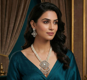 - Pendant Set Information - Made With Micro Size AD/Zirkon Stones Studded In It With Base Of Silver N Alloy Metal