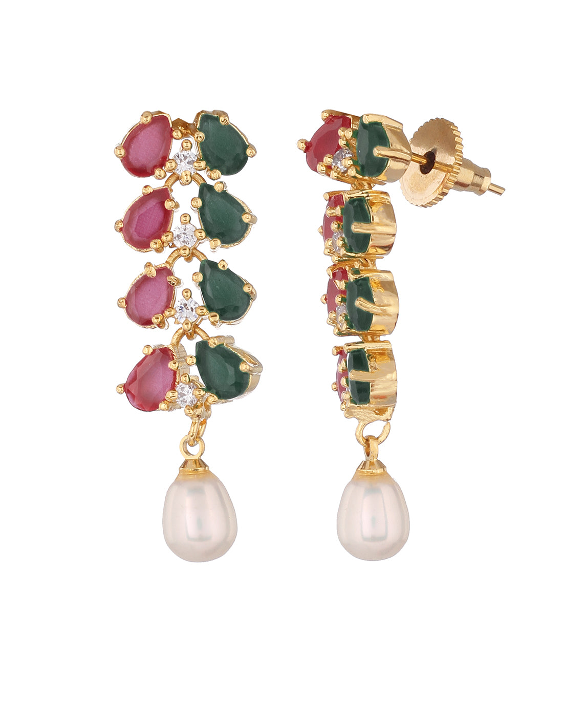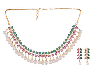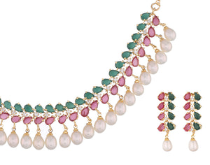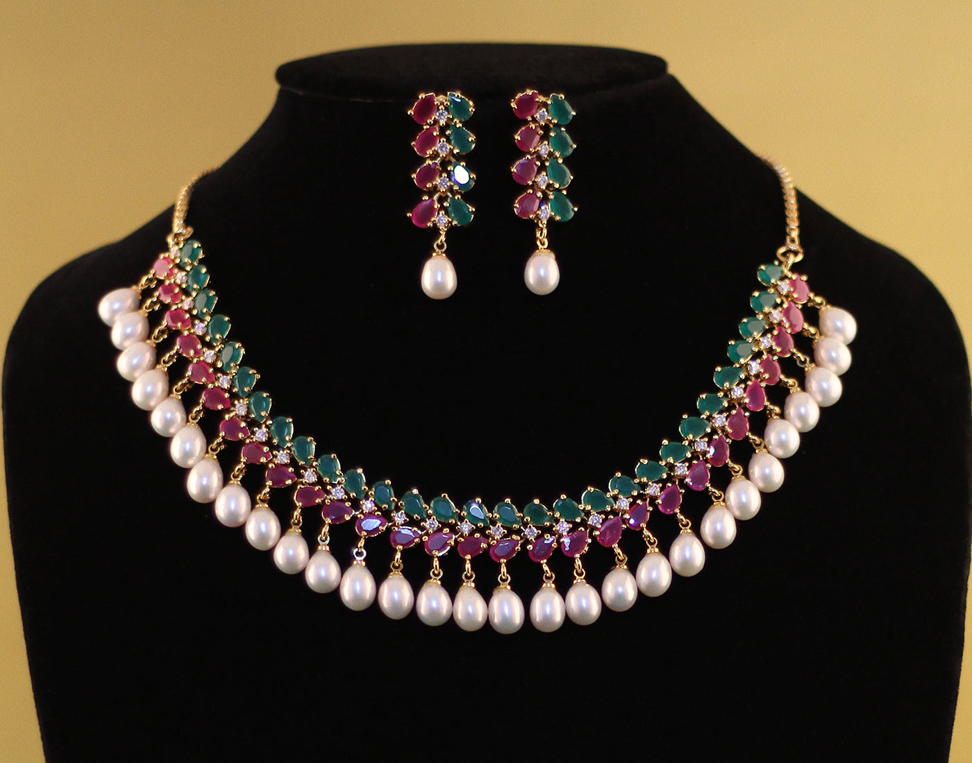 Cz Stone Studded Necklace Set With Real Pearl Drops With Certificate(D.No ADPRLS844)