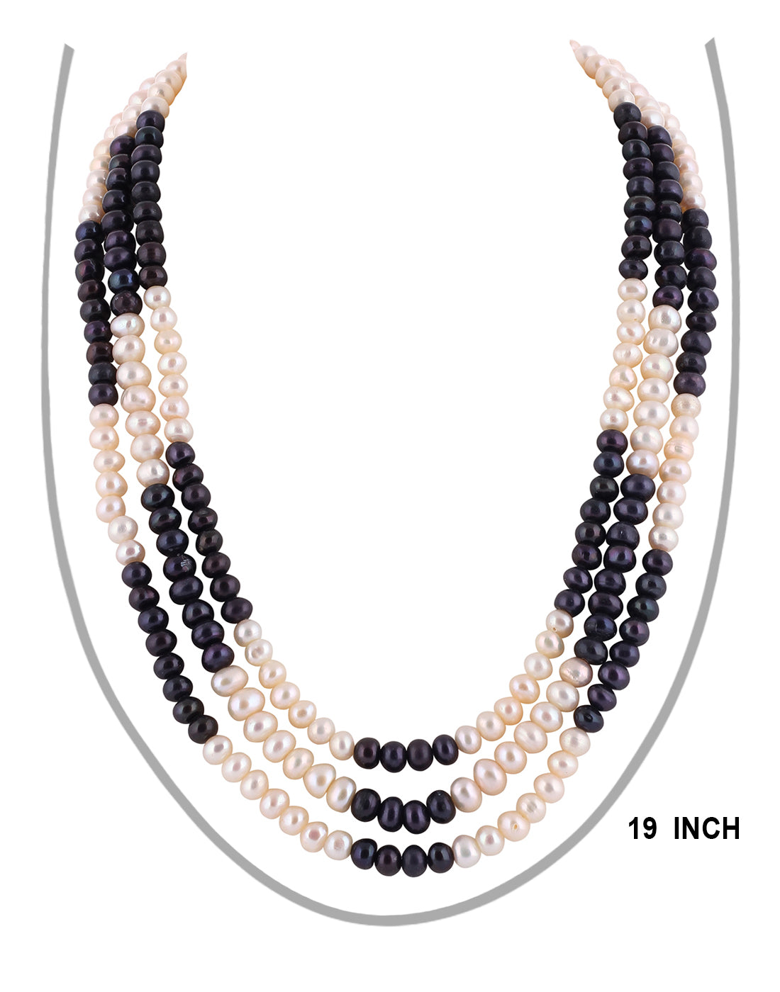 Real Natural Fresh Water Triple Line Plain Black N White Colour Pearls Mala Set 5 MM With Certificate(D.No NPS238)