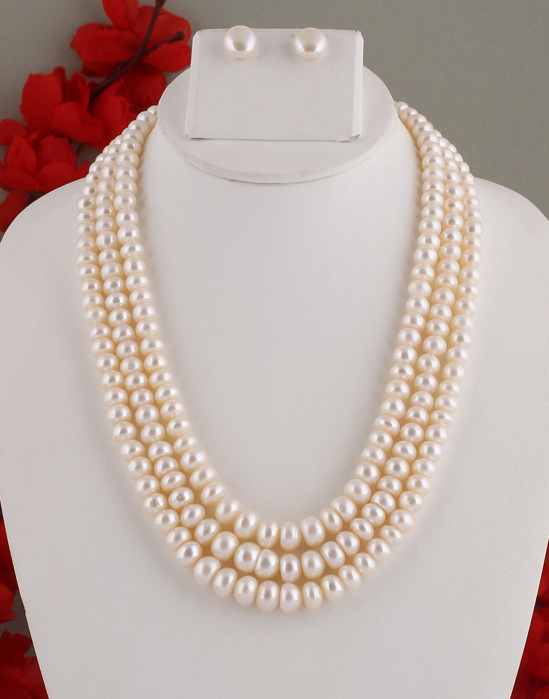 Real Natural Fresh Water Triple Line Plain Pearl 5 To 12 MM Graduation Mala Set With Certificate(D.No NPS261)